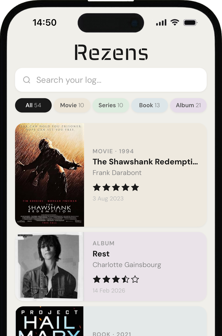 Tap the + button at the bottom to open the log sheet. Choose a category (Movie, Series, Book, or Album), type in the search field and tap Search.